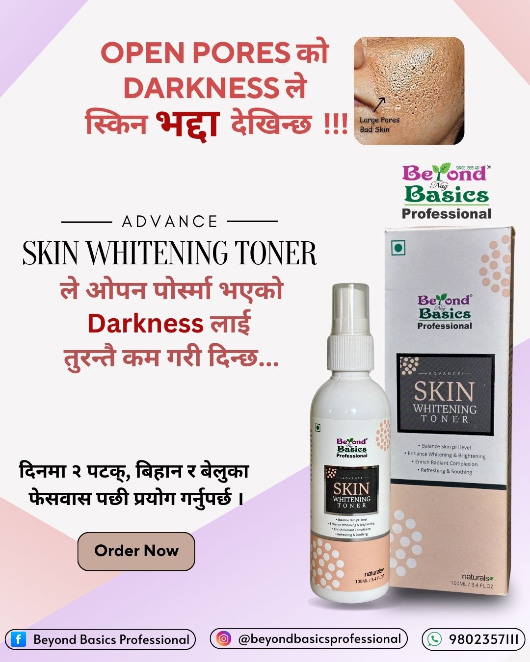 Reduces Pores & Prepares Skin for Skincare: The Beyond Basics Advance Skin Whitening Toner completes your cleansing routine by tightening enlarged pores and preparing your skin to better absorb moisturizers, serums, and creams. The Beyond Basics Advance Skin Whitening Toner leaves your skin clean, toned, and perfectly prepped for the next skincare step.