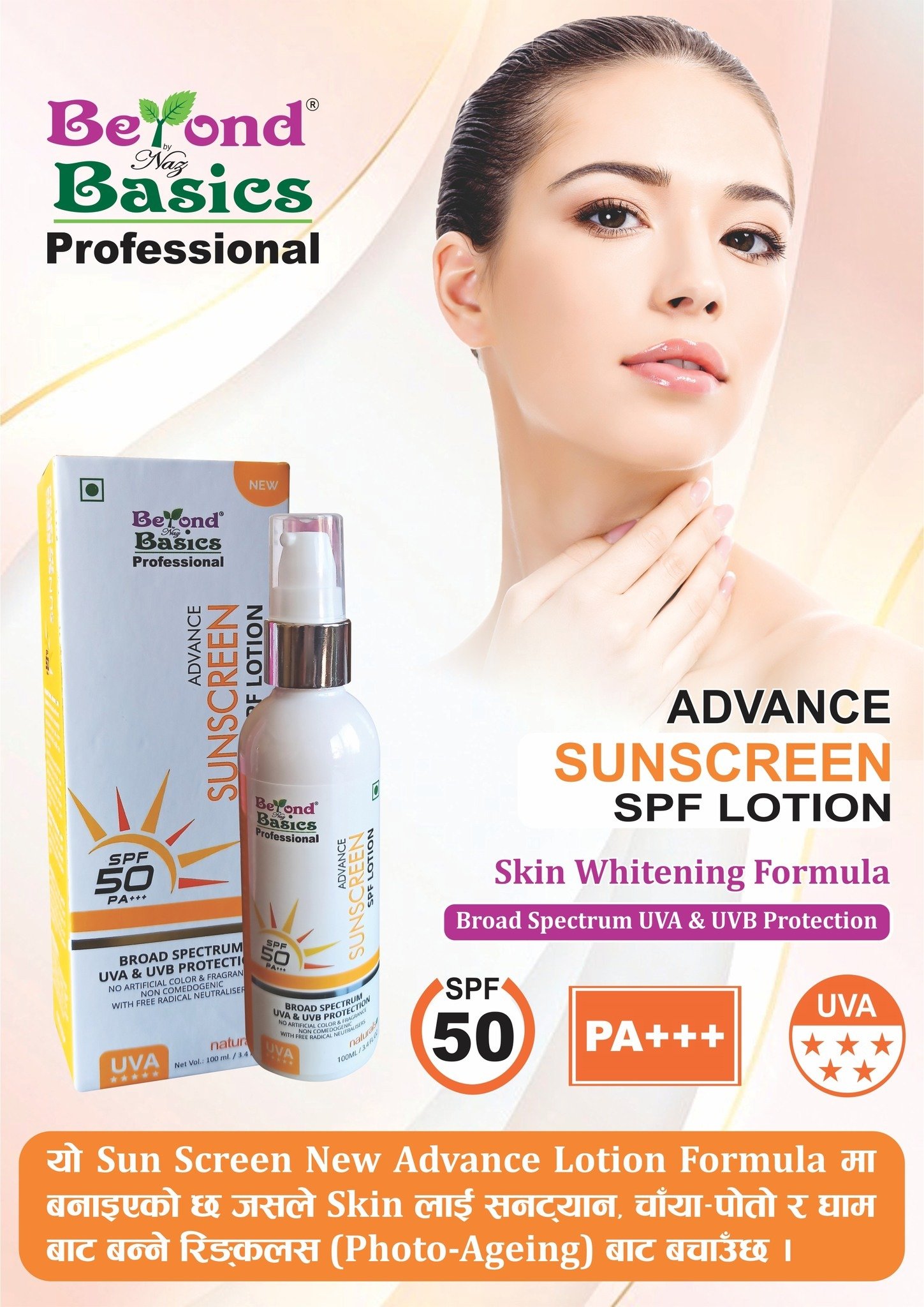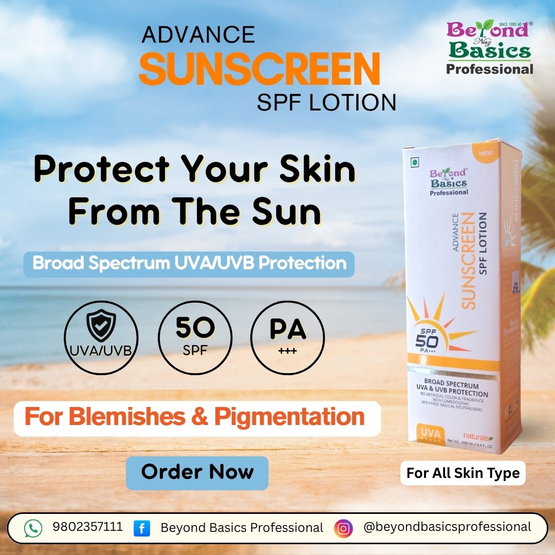 - Broad Spectrum UVA & UVB Protection: With its high-performance SPF, Beyond Basics Advance Sunscreen SPF Lotion provides comprehensive defense against both UVA rays (which cause premature aging, wrinkles, and pigmentation) and UVB rays (which cause sunburn and surface damage). This all-round protection keeps your skin safe from immediate harm and long-term sun-related damage.