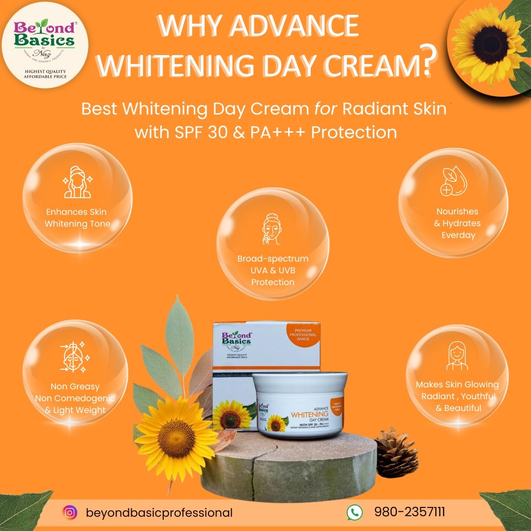 Broad Spectrum Sun Protection (SPF 30, PA+++): The Beyond Basics Advance Whitening Day Cream is fortified with SPF 30 and PA+++ that effectively guards your skin against harmful UVA and UVB rays. It helps to prevent sun tanning, dark spots, and pigmentation caused by daily sun exposure, keeping your skin evenly toned and protected all day long.