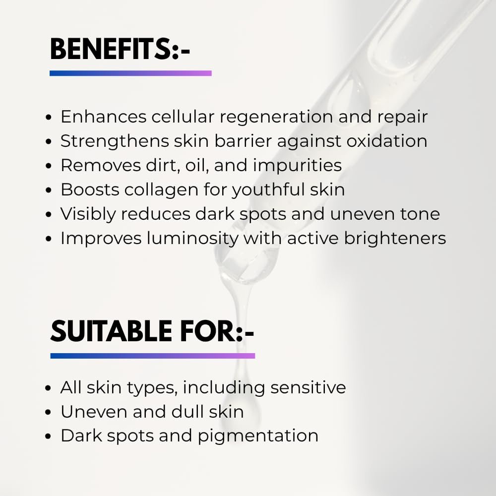 • Brightening & Radiance Boost: Vitamin C and Alpha Arbutin enhance skin glow, reduce dullness, and restore a healthy, luminous complexion.