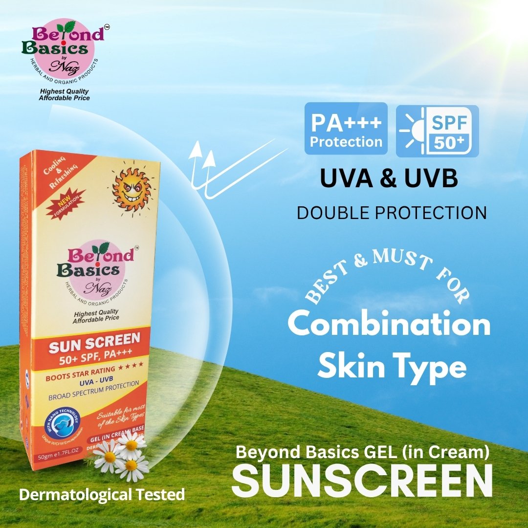 Beyond Basics 50+ SPF, PA+++ Sunscreen Gel in Cream helps to protect your skin from both harmful rays of UVA & UVB that results in Sun Tan, Sun Burn, Skin Darkening, Uneven Skin Tone, Freckles, Hyper-Pigmentation, Premature Aging, Finelines, Wrinkles, Damage to Skin Collagen & Elastin Fibres, Sagging of Skin, Ruddiness or Visible Spider Veins, Face & Skin carcinoma. The Sun Screen is suitable for combination Skin, and the sunscreen not only protects skin from Sun radiation but also from blue light that comes from your computer and mobile screen.